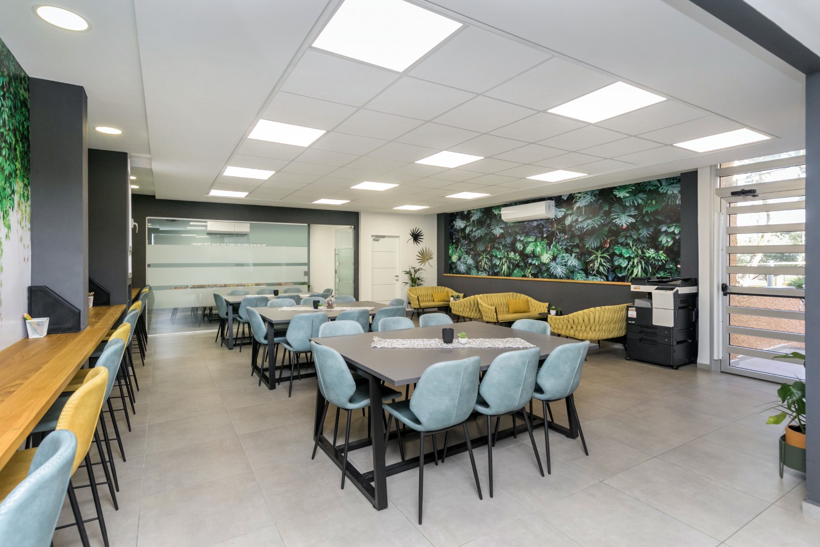 בין הריהוט הנבחר: שולחנות עבודה, פתרונות אחסון ולוקרים ,מטבח כולל אי וכסאות בר , חדר שיבות , כסאות לחדר ישיבות ,פינות המתנה , שולחנות המתנה , כסאות אורחים ..