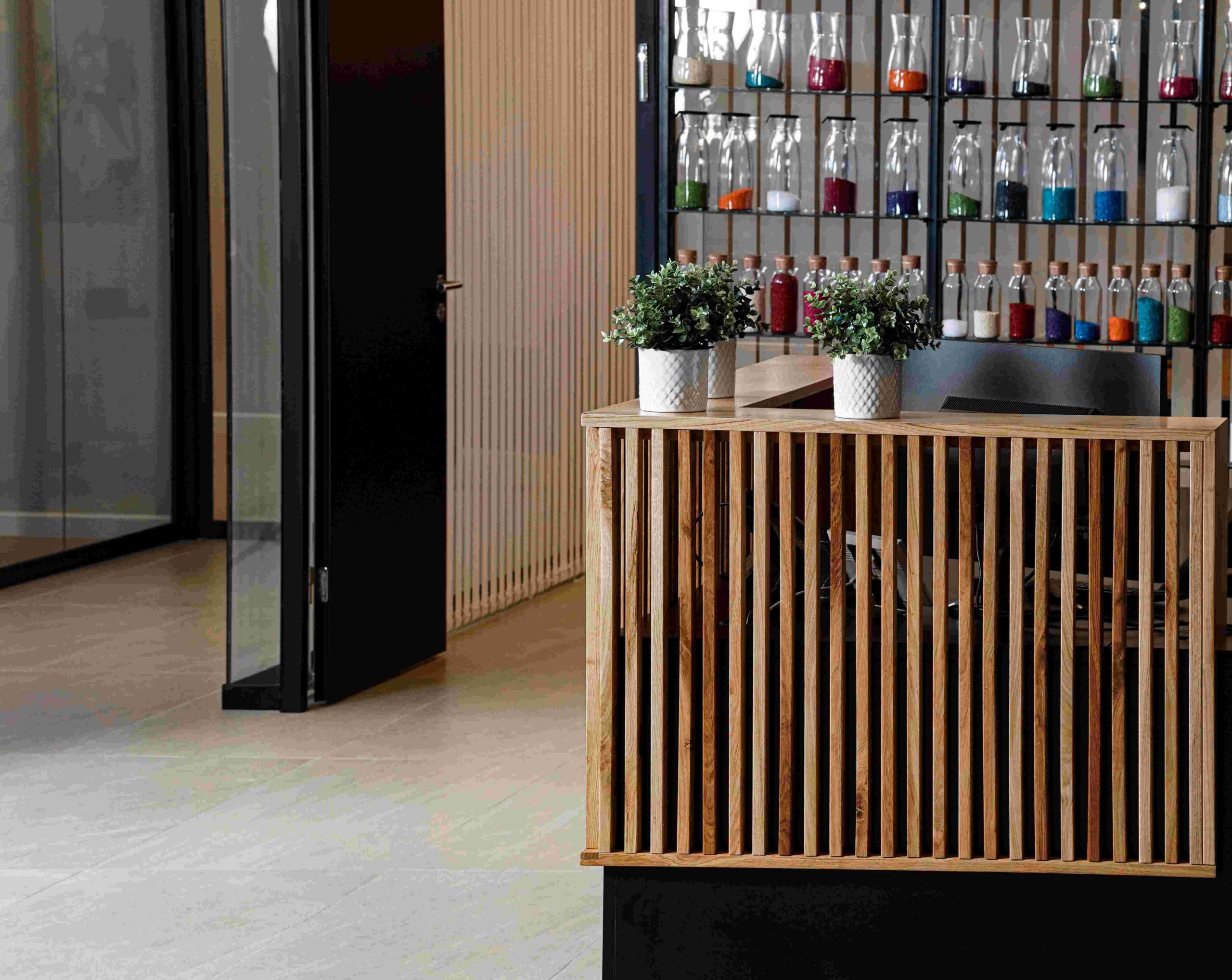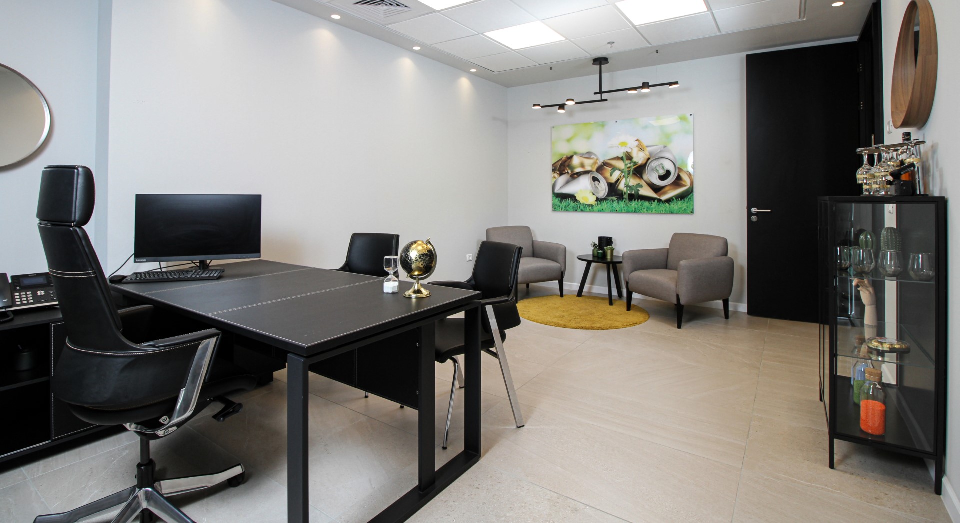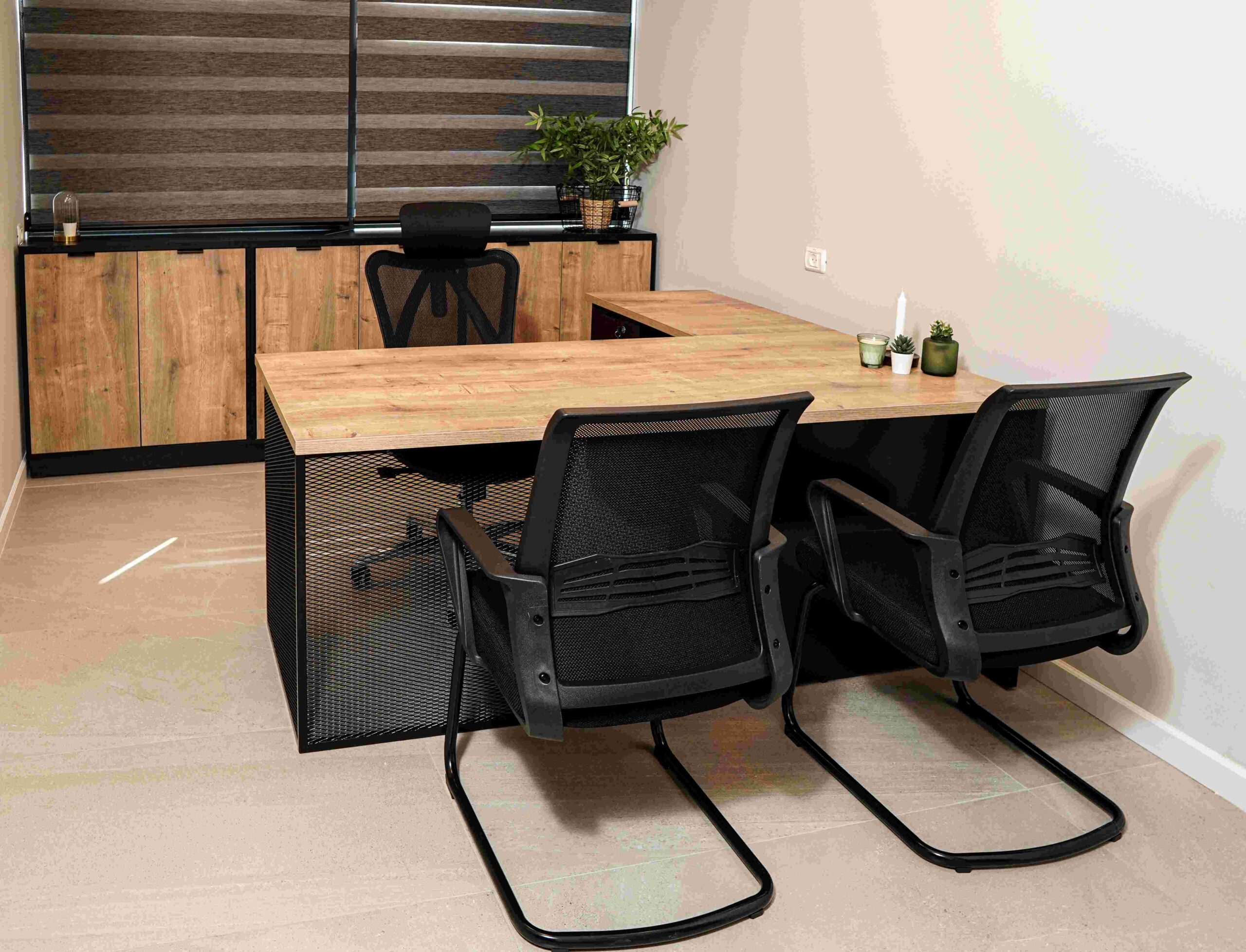 בין הריהוט הנבחר: שולחנות,דלפק כניסה , פתרונות אחסון , מטבח מעוצב וכסאות עבודה