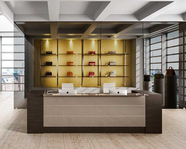 הדלפק בנוי בצורת "ח" מאורך, עשוי פורניר בגוון אגוז כהה ומשולב בחלקו החזיתי
