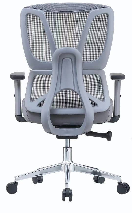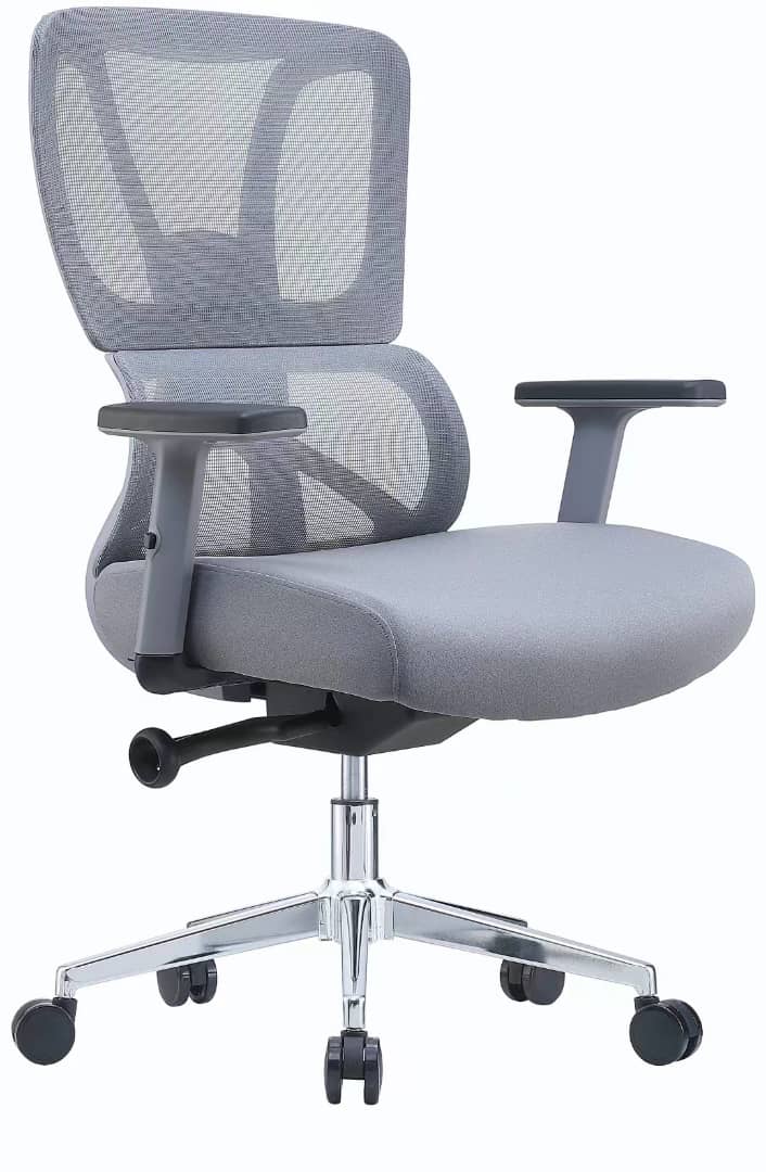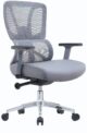 כיסא המשרדי דגם 302B של SIYI בעל מנגנון סינכרוני, בסיס אלומיניום יציב ומשענת גב מרשת נושמת. לכיסא מושב מרופד בבד ומסגרת פלסטיק אפורה/שחורה.