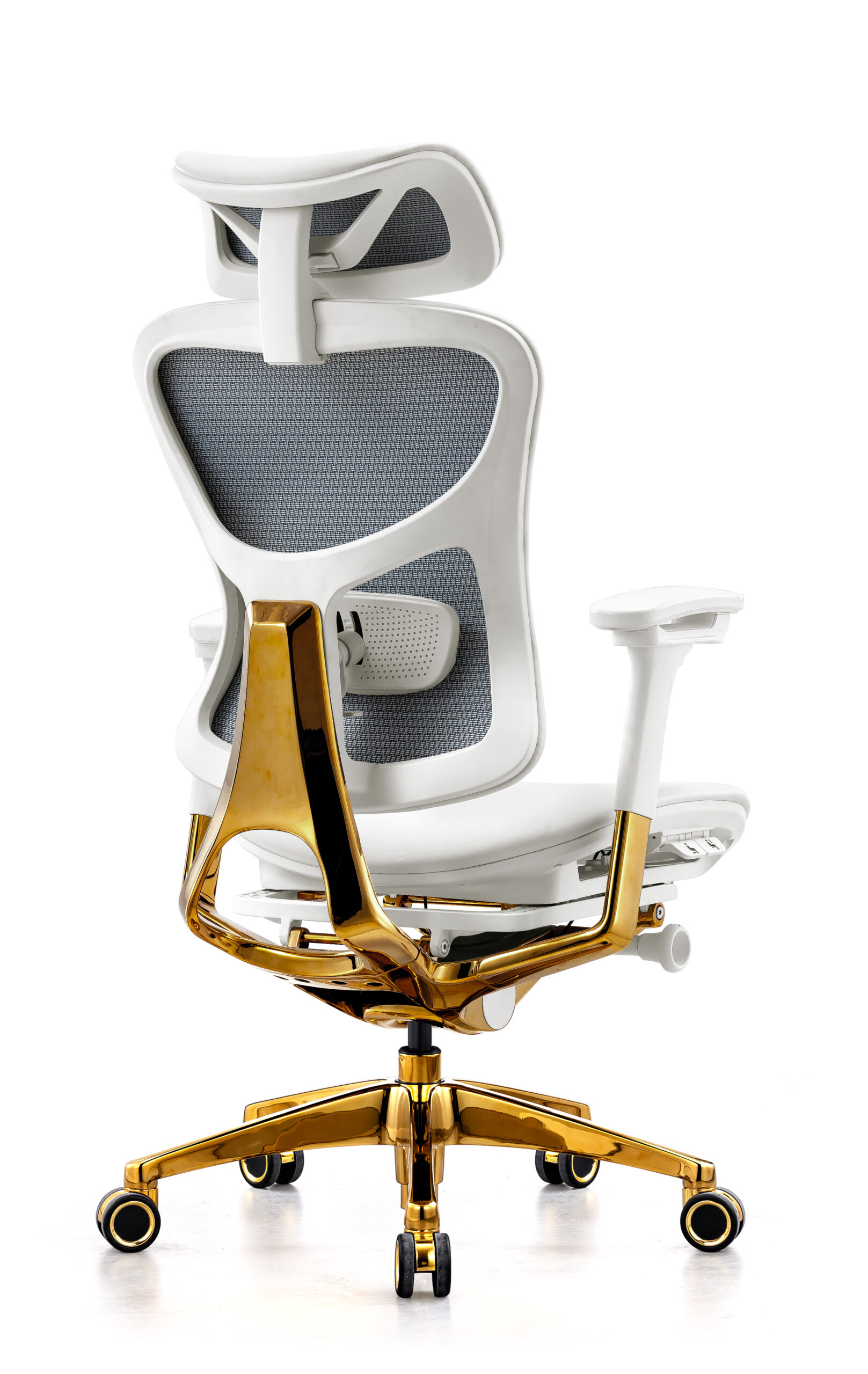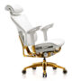 כיסא המנהלים Ergostar E-A-W-R מבית HENGFA כולל מנגנון סינכרוני חשמלי לנוחות אופטימלית, בסיס אלומיניום בגימור זהב וריפוד דמוי עור לבן.