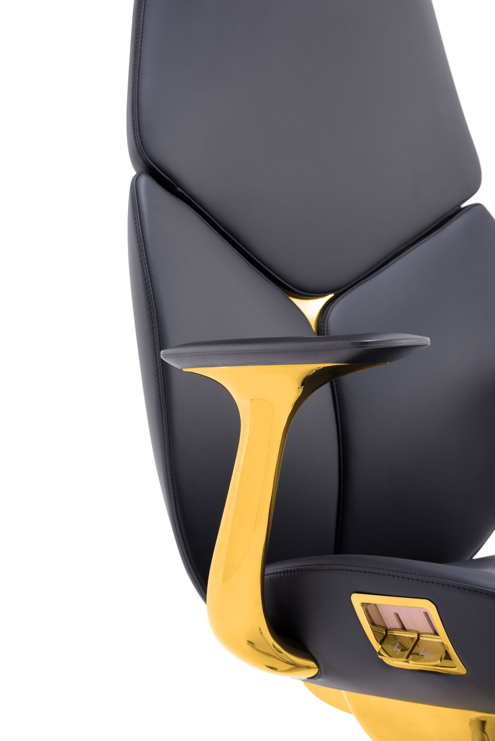 כיסא מנהלים דגם HS-608A מבית HANSON כולל מנגנון סינכרוני, המבטיח תנועה חלקה ומתואמת. הכיסא מגיע עם בסיס אלומיניום מוזהב עמיד וריפוד דמוי עור שחור, הזמין במגוון צבעים. הכיסא כולל ידיות קבועות, המספקות יציבות ותמיכה לשימוש ממושך.